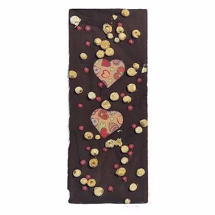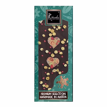 Zartbitterschokolade (Kakaomasse, Zucker, Kakaobutter, Emulgator: Sojalecithin, Bourbon-Vanille), gefriergetrocknete weiße Johannisbeeren 1,5 %, Ruby Choco Crisp pearls 1,5 % (Ruby Schokolade (Zucker, Kakaobutter, Magermilchpulver, Vollmilchpulver, Kakaomasse, Emulgator: Sojalecithin, Zitronensäure, natürliches Vanille Aroma), Weizenmehl, Zucker, Weizenmalzmehl, Backtriebmittel: E500ii, Salz, Glukosesirup) Herz Dekor (weiße Schokolade (Zucker, Kakaobutter, Vollmilchpulver, Emulgator: Sojalecithin, Bourbon Vanille), modifizierte Stärke, Zucker, pflanzliches Fett, Glycerin, Farbstoffe: E122, E110). Kakao mindestens 60%, 84%.