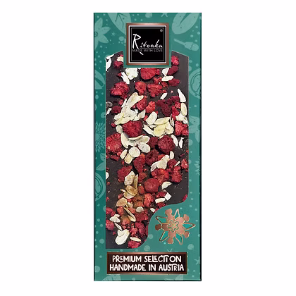 Die Ritonka Gourmet Bitterschokolade mit Himbeeren, Mandel und Zimt ist eine köstliche Kombination aus hochwertiger dunkler Schokolade, fruchtiger Himbeere, knackiger Mandel und würzigem Zimt. Diese harmonische Mischung von Aromen verleiht der Schokolade eine einzigartige Geschmackserfahrung.