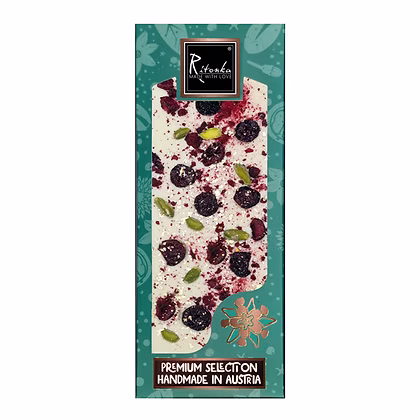 Schreibe die erste Rezension für „Gourmet weiße Schokolade; Kirsche, Pistazien, Blattgold 130g“