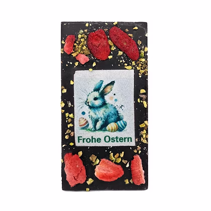 Genieße unsere exklusive Oster-Schokoladentafel aus feinster Bitterschokolade, veredelt mit hochwertigen Zutaten. Die Kombination aus gefriergetrockneten Erdbeeren, knackigen Pistazienstückchen und einem liebevollen Osterhasen-Motiv macht diese Tafel zu einem besonderen Genussmoment.