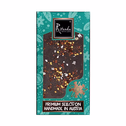 Mit feinster Bitterschokolade, Salzburger Bergsalz und Chili zaubern wir für Dich einzigartige Delikatessen, die nicht nur das Auge erfreuen, sondern auch für eine wahre Geschmacksexplosion sorgen. Der intensive Schokoladengeschmack wird durch hochwertige Kakaobohnen aus nachhaltigem Anbau erzielt und durch eine perfekte Balance mit einer Prise Salz abgerundet. Pur als Snack für zwischendurch oder als besonderes Geschenk für Deine Liebsten – unsere handgemachte Bitterschokoladentafel ist ein wahrhaftiger Genuss für alle Naschkatzen! Die Salzburger Bergsalz und Chili werden von Hand auf jede Tafel Schokolade aufgetragen und sorgen damit für ein Unikates Erscheinungsbild. Lass Dich von unserem handwerklichen Können verführen und tauche ein in die süße Welt von Ritonka!