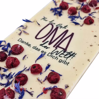 Verwöhn die liebste Oma der Welt mit einer unwiderstehlichen Kombination: Weiße Schokolade, Johannisbeeren, Kornblume – ein Geschenk, das Herzen höher schlagen lässt! 🎁💖